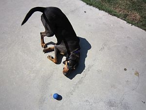 I just wanted to update you on Annabel.  She is doing great!  She has started to warm up to Shylo.  They have been playing in the backyard with her favorite ball.  It didn't take her long to find the toy box in the house and claim some favorite house toys.  We are working on walking nice, sit, wait, stay out of the kitchen when cooking and off.  She is a very smart hound and has quite the personality!!!!  These are some pictures of the first day we had at home with her.  I took her to the Senior Lodge here in Bonnyville today and she was quite the hit.  I have been taking Shylo for a couple of years. The Seniors loved them.