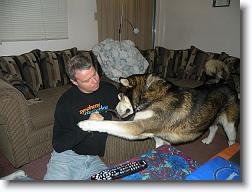 It’s been nearly six months since we made the long, long drive down from Edmonton to Creston, to add MacKenzie to our lives, and so I thought this would be a good time to touch base again, and send some photos too.   MacKenzie has fit in well with our family, and our other dog, the lovable Cara. Watching their relationship grow has been fascinating. Cara is 10, and acts very much like the big sister. MacKenzie can drive her crazy, but he’s also brought out a sense of play in her that I think has been great for both of them.   MacKenzie is very attached to all of us now. He’s shown that he is bright, teachable, and eager to fit in. He’s also shown that there is never a time that he doesn’t think is playtime. He wants to play all the time, and he’s a lot to keep up with! He’s still the kleptomaniac – he can snap a mitten out of your hand and be halfway across the yard before you know it’s missing. But he’s also getting much better at surrendering the mitten when asked.   Each of us has worked out our own relationship with MacKenzie. Our youngest, Declan, has a way of getting MacKenzie to vocalize that none of us can match. I’ve attached a short movie clip of that – it’s pretty funny.   We’re still working on things with him – particularly loose-leash walking when a cat shows up – but we’re very happy that MacKenzie is part of our lives. He’s healthy, happy, an armload, and an enthusiastic goofball.