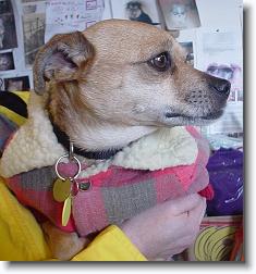 She sure is a cuddler! Jennie walks around the house with her "baby" Nellie up on her chest and shoulder. And whenever one of us is sitting she jumps into our lap, unfortunately without warning. I'll be teaching her to wait until invited, in case I have a beverage in my hand, or we have a guest who has not "gone to the dogs" yet. Jennie has taken to calling Nellie, "Ninnie"... She does not seem to mind or be confused, so we will just go with it.